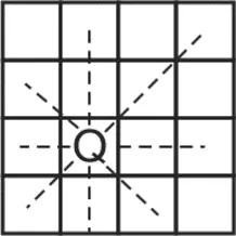 Two queens are attacking each other if they are in the same row, column, or diagonal. Cells attacked by queen Q are shown in fig. (e).