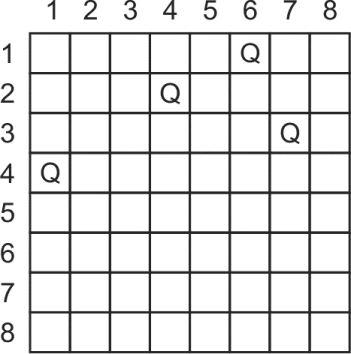 (2, 4). Partial solution is <1, 4> - Now, Q3 can be placed at position (3, 2). Partial solution is <1, 4, 3>.